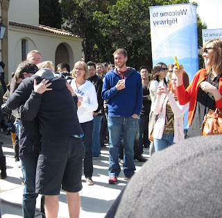 We had Julie positioned down by the street in anticipation of what would happen next. The limo pulled into our parking lot and stopped right in front of the entrance. I had asked Joel to wait for 30 seconds or so to add some drama to their entrance. Finally, with all eyes trying to figure out what the deal with the limo was - Joel opened the back door and emerged. Check out Julie's reaction as she saw Joel!
